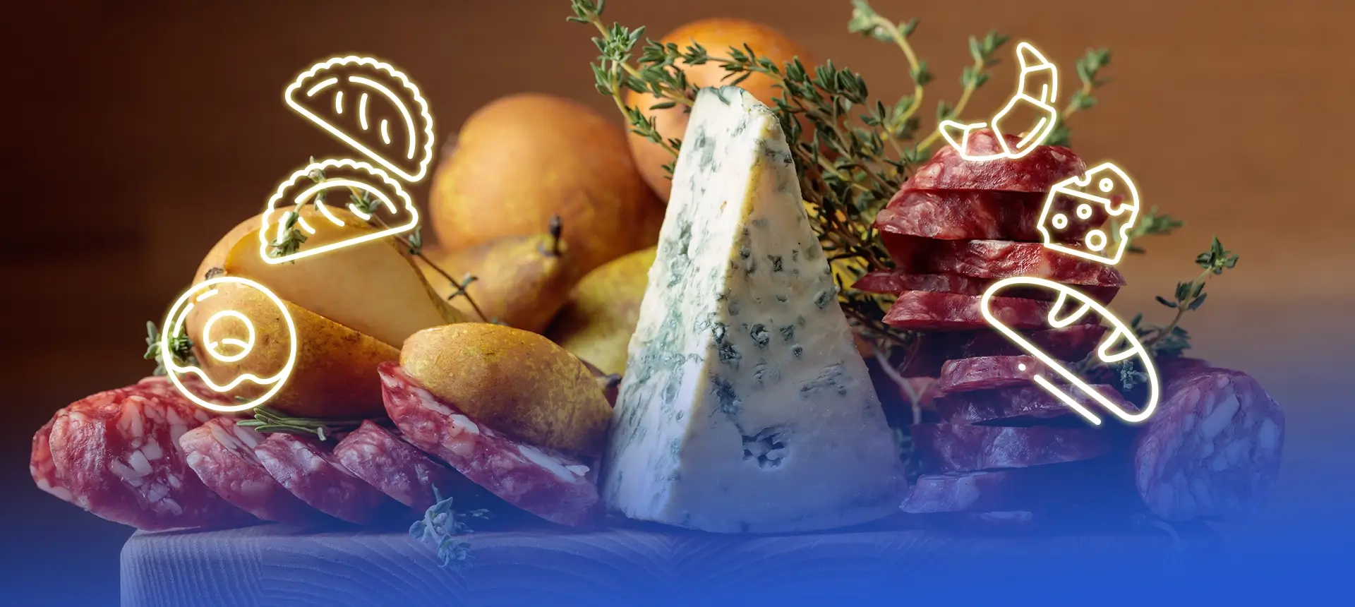 Poultry: white sausage from turkey meat, duck pate with cranberry, ham from turkey meat, dumplings with duck meat filling